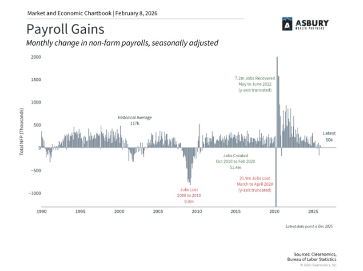 The labor market data deserves close attention. Weakness emerging simultaneously with slowing inflation creates an environment conducive to Fed easing. Markets currently price in at most two rate cuts this year, with the benchmark rate landing around 3%, the level policymakers view as "neutral." However, if labor market deterioration accelerates while inflation continues moderating, the Fed may have room to move more aggressively than consensus expects. Kevin Warsh, despite his hawkish history, has recently expressed support for lower rates driven by productivity improvements. More on this below.